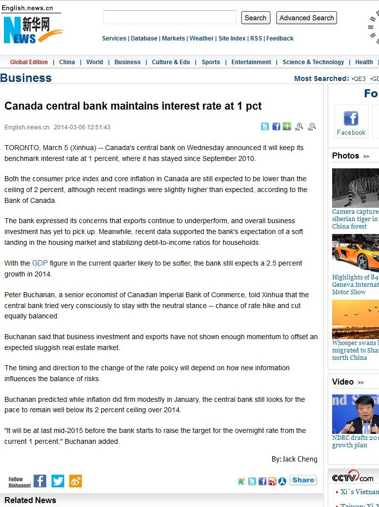 Peter Buchanan, a senior economist of Canadian Imperial Bank of Commerce, told Xinhua that the central bank tried very consciously to stay with the neutral stance, with the chance of rate hike and cut equally balanced.