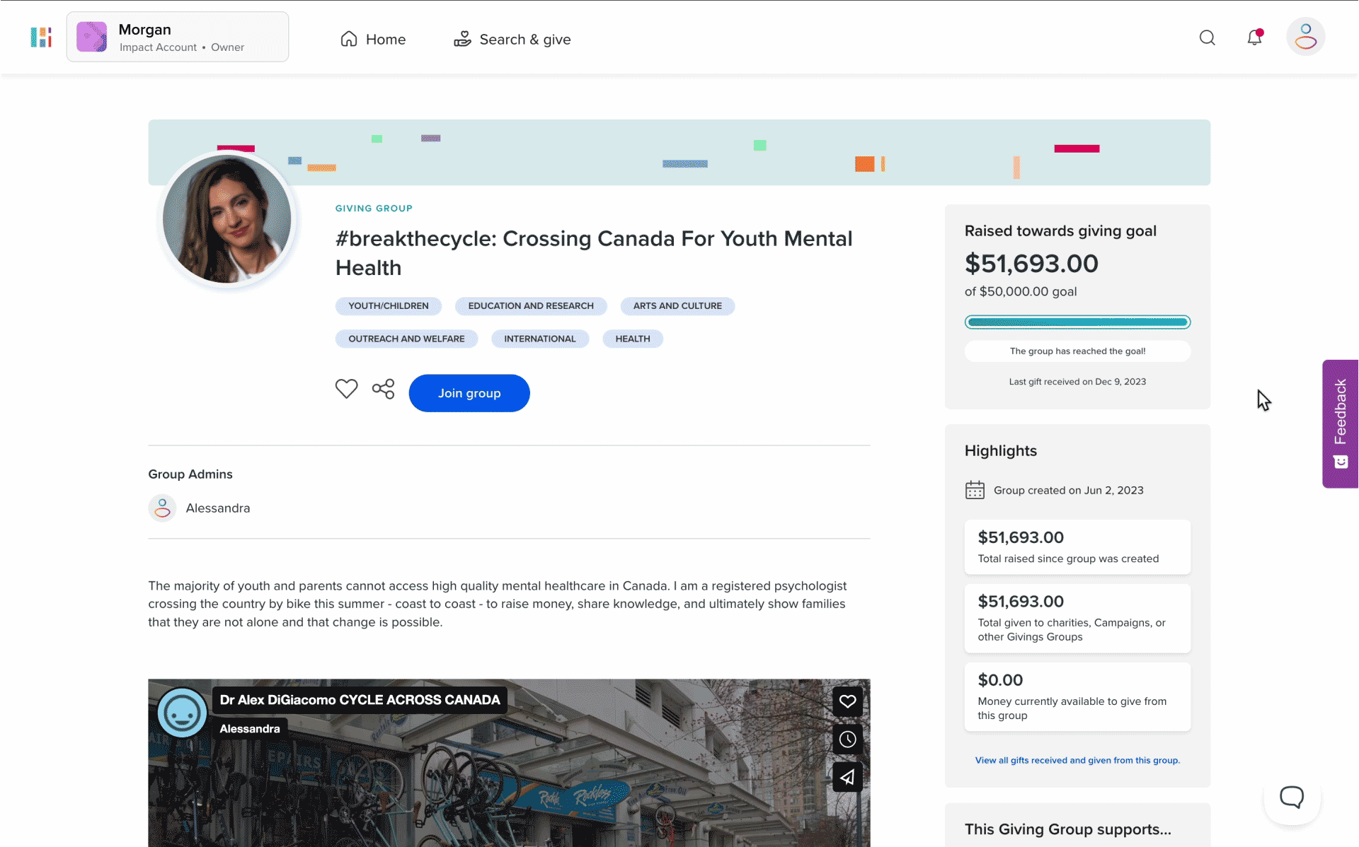 Alex’s journey across Canada demonstrated the power of community-driven giving. By using a Giving Group, she was able to fundraise on her terms, engage donors and her community transparently, and create an ongoing impact on youth mental health. Her story is an inspiring example of how anyone can use Giving Groups to raise funds for causes they care about in a meaningful and effective way. Whether it’s a cross-country ride, a birthday, a wedding, or any event that brings people together, Giving Groups make it easy for you to pool contributions and support the causes that matter most.